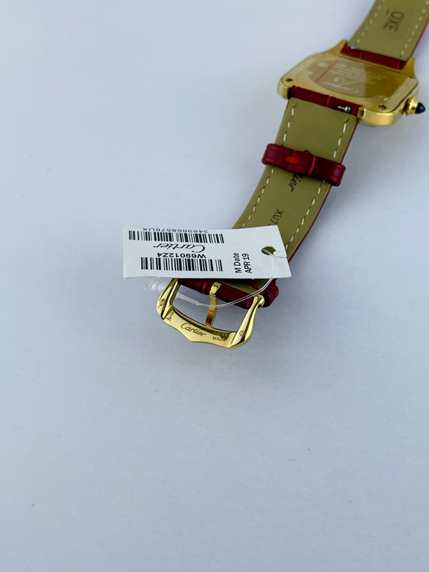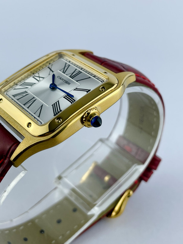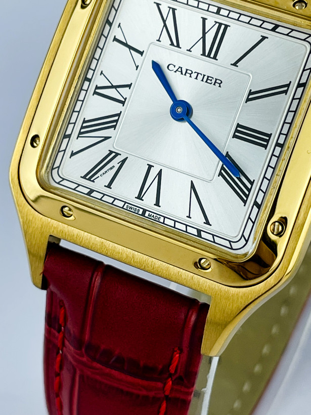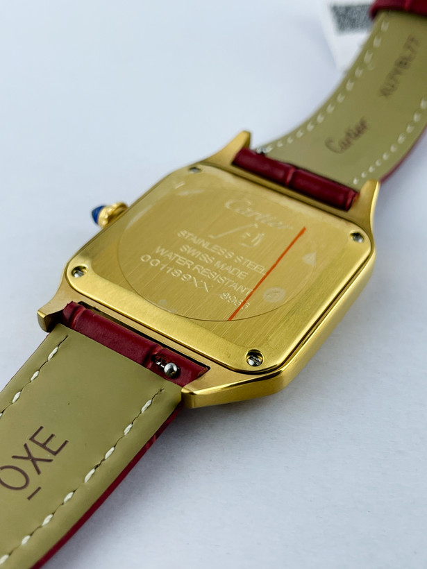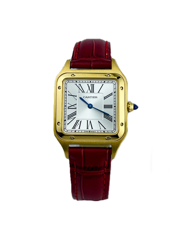 ساعت مچی مدل Cartier Santos Dumont یک انتخاب لوکس و بینقص برای کسانیست که به ظرافت و اصالت اهمیت میدهند. این مدل مسترکپی با طراحی کاملاً مشابه نسخه اورجینال، دارای قاب مربعی طلایی، صفحه سفید با اعداد رومی کلاسیک و عقربههای آبیرنگ است که ظاهری شیک و متمایز به آن میبخشد. بند چرمی قرمز رنگ با دوخت دقیق، ترکیبی خاص و چشمنواز را کامل میکند.