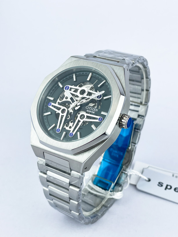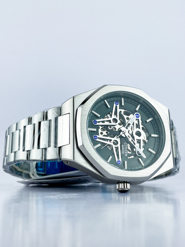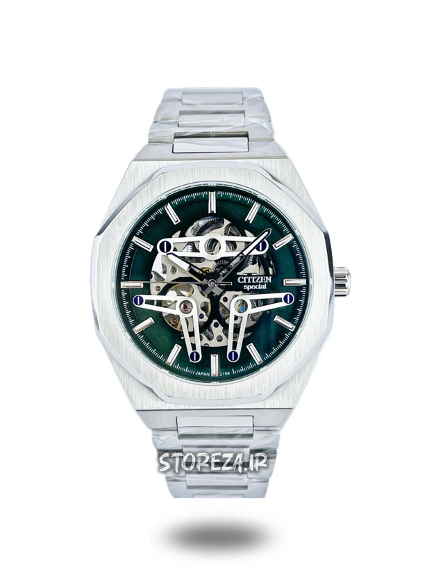 ساعت سیتیزن اسپشیال اتوماتیک مردانه یک انتخاب لوکس و خاص برای کسانی است که به دنبال ترکیبی از هنر و مهندسی هستند. طراحی اسکلتون این ساعت، قلب تپنده مکانیزم ژاپنی را در مقابل چشمان شما به نمایش میگذارد. قاب هشتضلعی برسخورده، صفحه سبز زمردی و عقربههای فلزی با جزئیات آبی، هارمونی رنگی چشمنوازی ایجاد کرده که آن را از هر ساعت دیگری متمایز میکند.