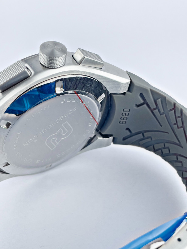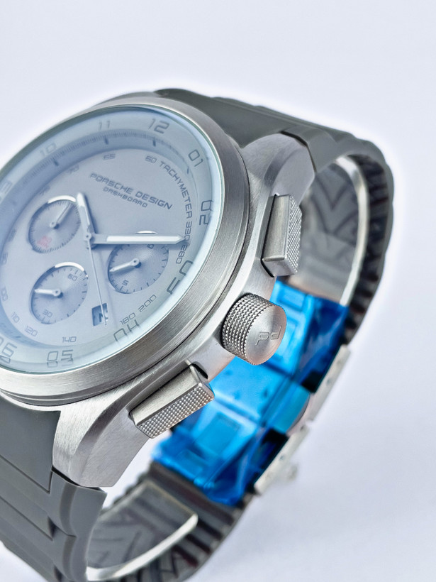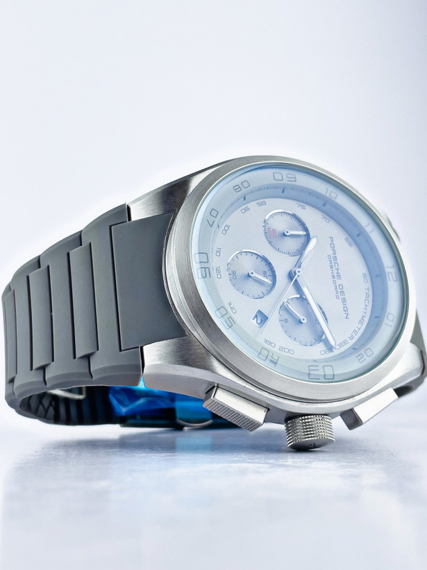 صفحه نقرهای-خاکستری با سه سابدایال (کرنوگراف) و نوشتههای ظریف “Porsche Design” جلوهای لوکس و حرفهای به ساعت داده.